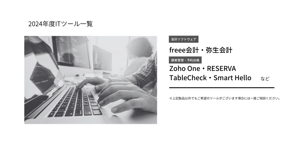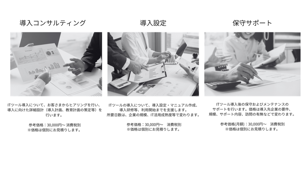 今、抱えている悩みや課題をヒアリングし、その内容に合わせてITツールのご提案から導入・導入後の設計、研修、保守サポートまでお手伝いしております。